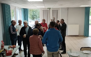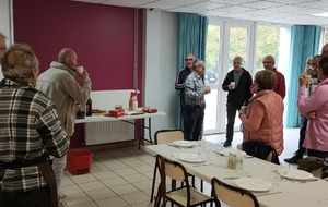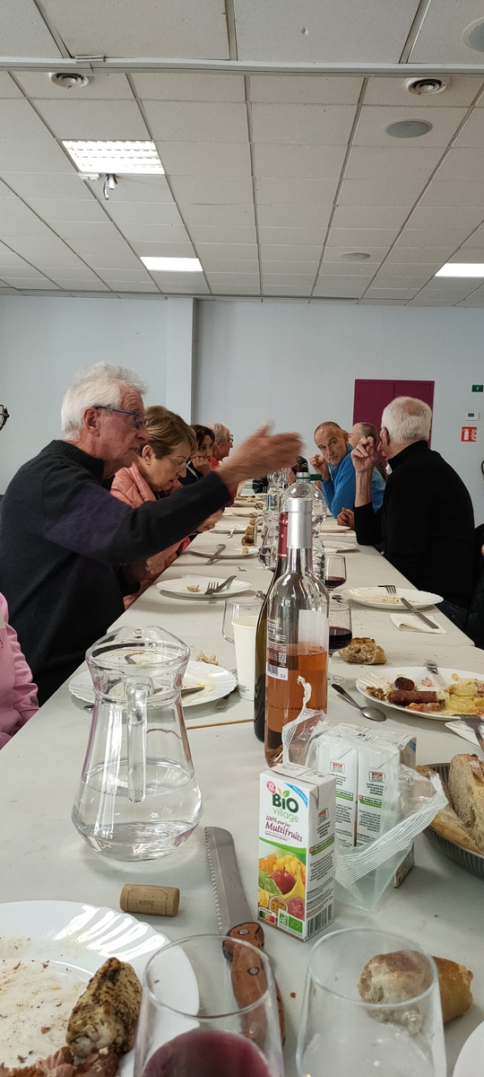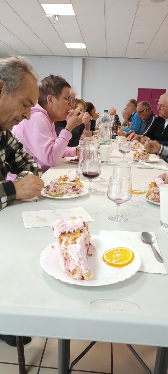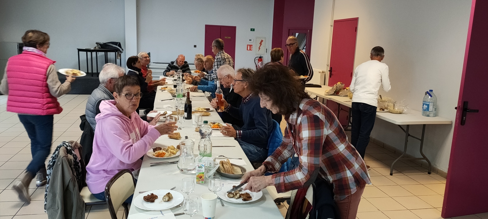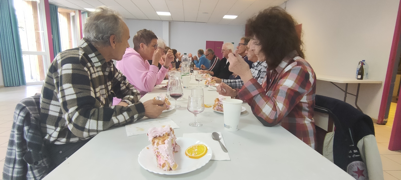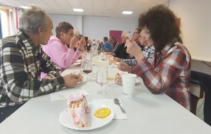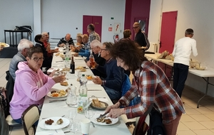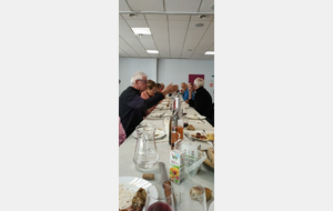 Après cet apéritif pris en commun autour de la tireuse à bière et des cacahuètes pas encore périmées, nous avons refait un peu le monde vu l’actualité chargée de ces dernières semaines ça aurait pu durer plus longtemps !!!! ensuite nous avons pris place à table afin de festoyer, après les crudités servies par les épouses de nos cyclos, place à la viande cuite avec passion et savoir-faire par notre cuistot en chef, je citerai Yvon. Un p’tit verre de rouge ou rosé pour agrémenter ce sympathique repas, et après les fromages ces dames nous ont gentiment servi le gâteau avec le sourire pour terminer, avant un petit café.