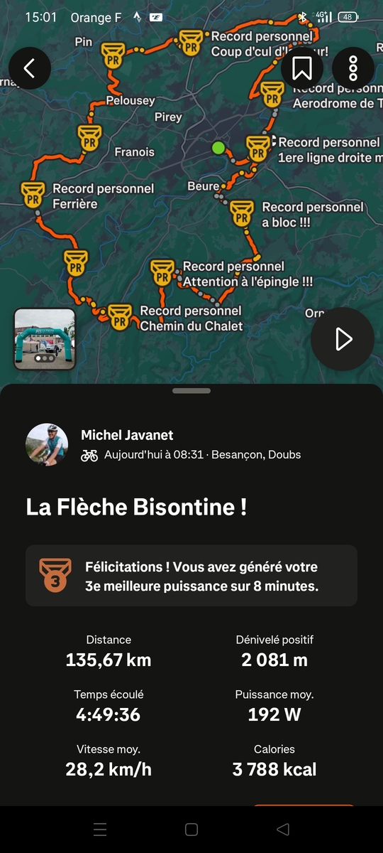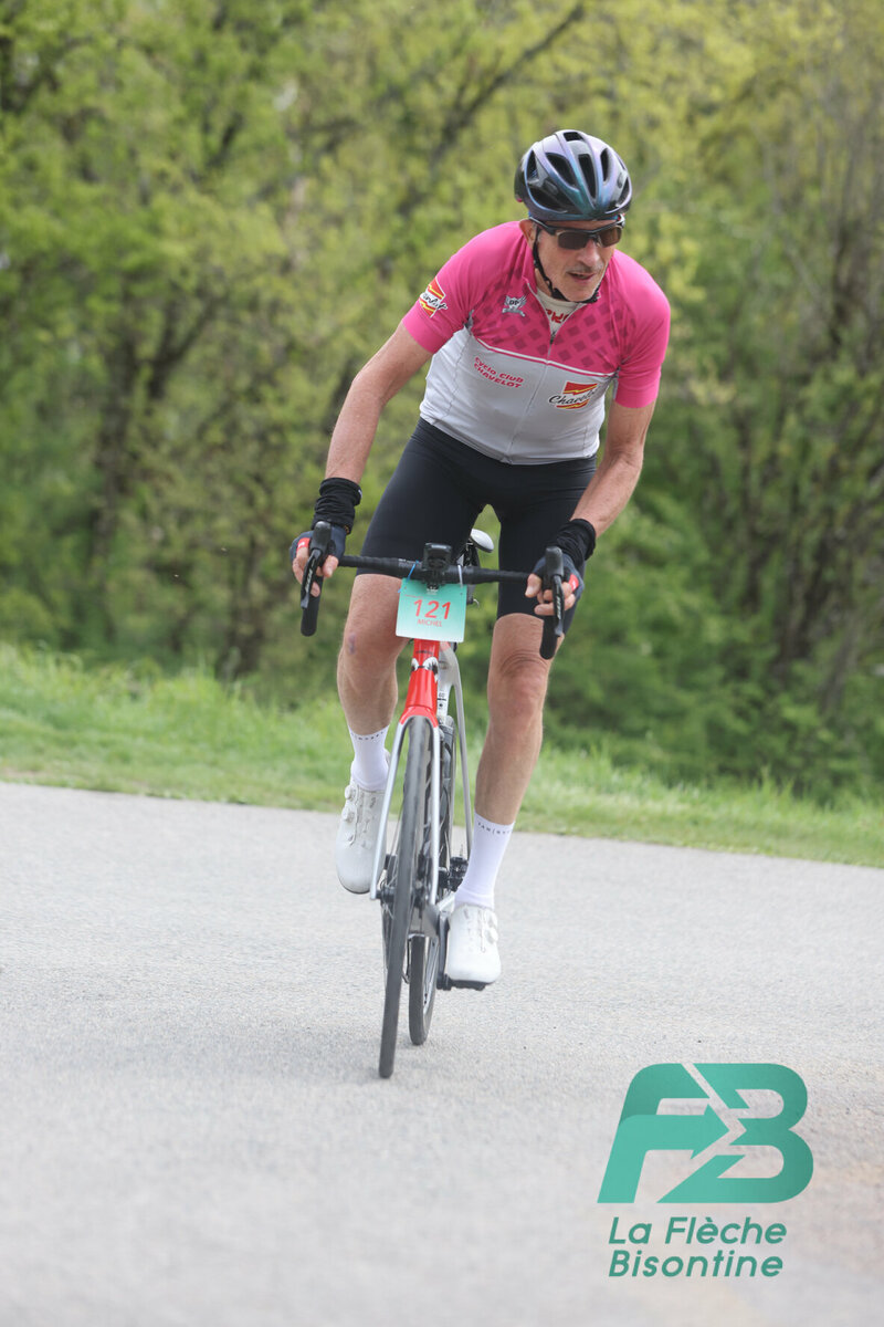 Après la Route Thermale à Vittel, direction Besançon pour participer à La Flèche Bisontine le dimanche 27 avril. Pour cette épreuve, un seul Chavelotais, Mimi, 2 parcours au programme comme l’année dernière, mais vu la distance autant en profiter un max, donc me voilà parti pour le 130 km, 350 cyclos au départ, une bonne météo bien meilleure qu’en 2024, ça roule fort tout le temps mais en étant dans des groupes cela paraît plus facile, quoique !!!!! surtout qu’à la fin il ya la montée de la Malate : 6 km dont les 2 premiers sont à plus de 10%, aïe !! mais en gérant ça passe.