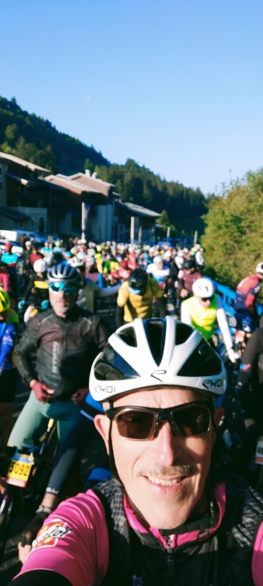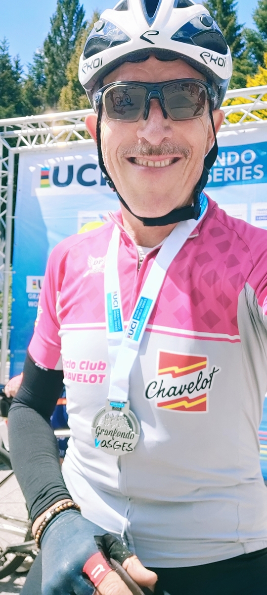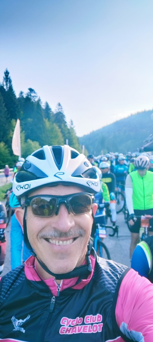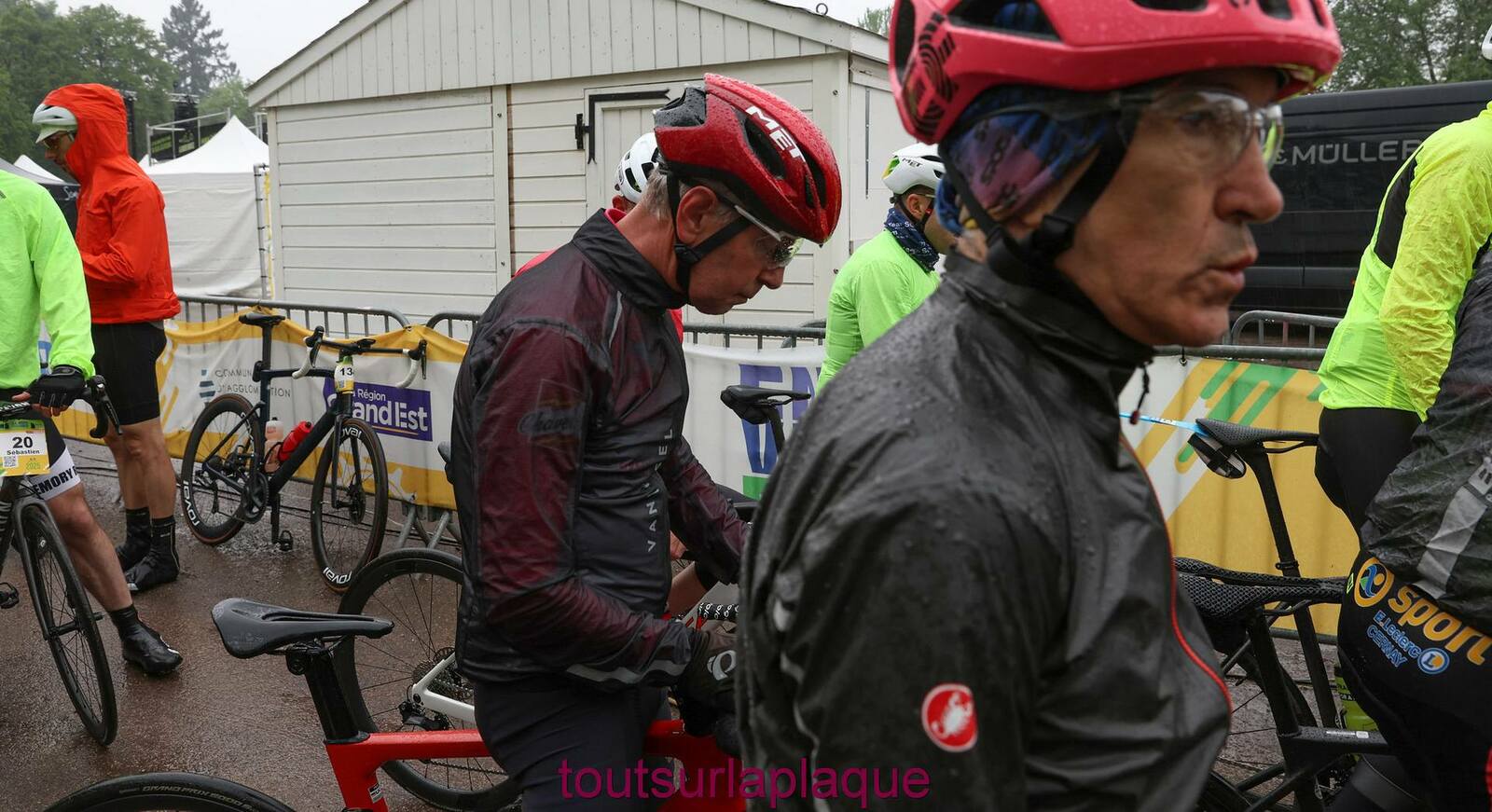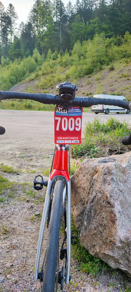 Le dimanche 18 mai, direction La Bresse « à bonne heure » pour la Granfondo Vosges, toujours les deux mêmes Francis et Mimi, engagés le grand parcours 175 km pour 2800 m de dénivelé. Grosse affluence cette fois, ça nous change, 1200 concurrents environ sur le grand parcours, 2500 en tout, et comme toujours ça roule très fort car la majorité des coureurs est étrangère et ils ne sont pas venus faire du tourisme, vu que cette épreuve est qualificative pour les championnats du monde de cyclosport en Australie. Comme on dit « toujours en prise », très peu de moments de répit durant la course, ils ne font que relancer tout le temps il ne faut pas rester à la traîne sinon tu te fais éjecter rapidos !!!!!