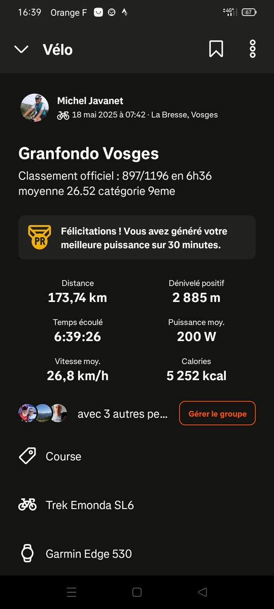 Résultat : je me classe 209ème sur 333 et 6è sur 11 dans ma catégorie en 4h33 à 29,7 km/h de moyenne.