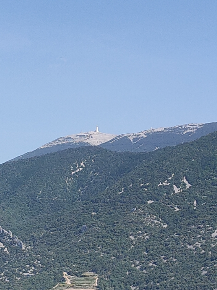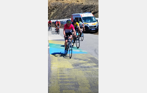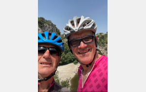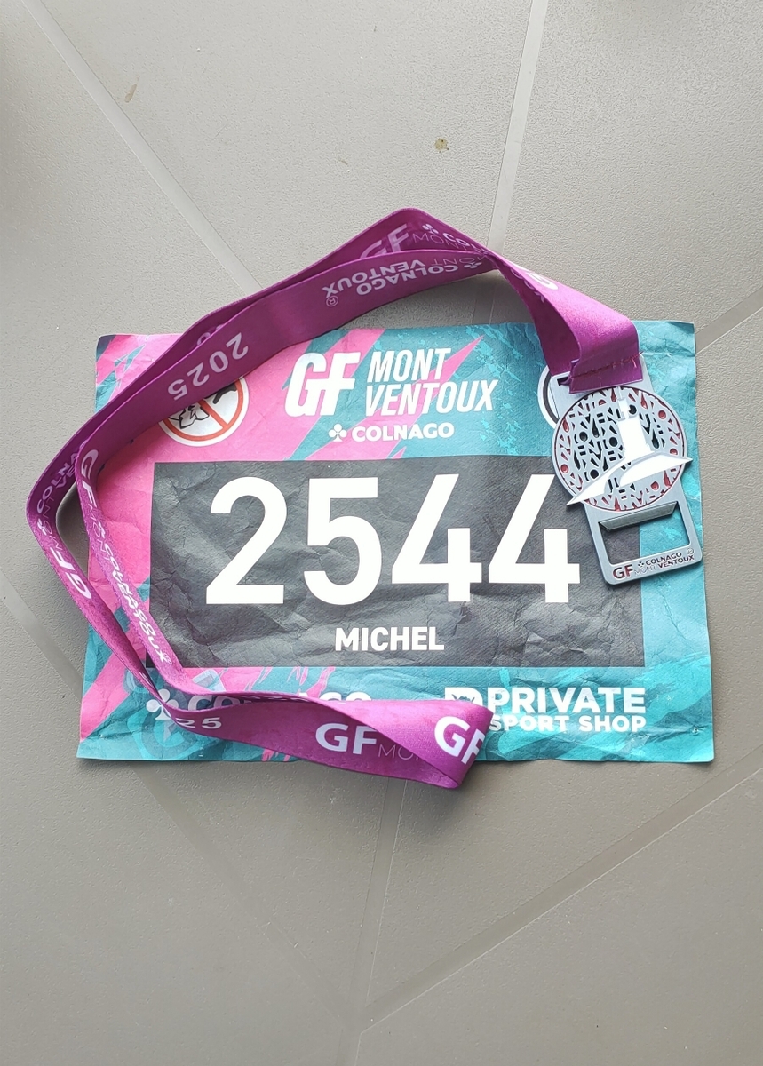 Départ de Vaison avec plus de 4000 cyclistes habillés du même maillot, cela fait un sacré peloton !!! départ sur les chapeaux de roue, pas de difficultés particulières, jusqu’au col de l’homme mort long de plus de 10km avant la bascule sur Sault, où les parcours se séparent, pour le plus long direction les Gorges de la Nesque, toujours aussi magnifiques mais pas trop le temps d’admirer le paysage, la route étant fermée ça descend à fond la caisse 45 de moyenne sur les 18km…après quelques faux plats un peu pénibles arrive le virage de Ste Colombe, et là ça fait mal faut tout mettre à gauche dès le début, et après quelques kilomètres voici notre Mimi qui tombe en passe sèche, plus rien du tout, pas facile à gérer, mais après un ou 2 arrêts (je ne sais plus) ça repart péniblement en attendant le Chalet Reynard pour se refaire la cerise au ravitaillement, et après il reste encore 6km mais moins corsés, et tout à coup l’arche d’arrivée !!! Ouf