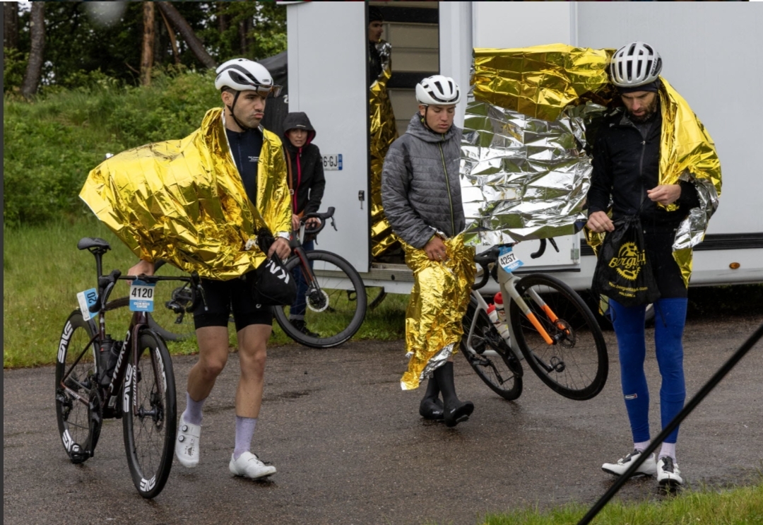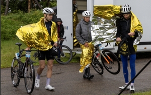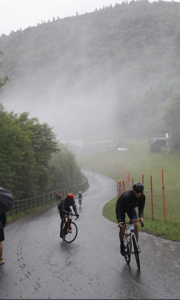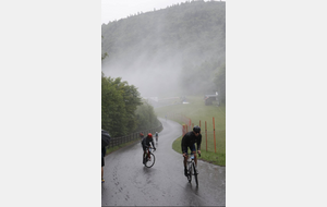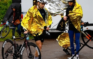 Une semaine plus tard ont lieu les 3 Ballons, 2 Chavelotais Francis et Mimi au départ de Ronchamp, Francis ayant pour objectif la Marmotte s’engage sur le Granfondo 180km pour 4000m de dénivelé, départ 7h sous un ciel menaçant, 12 premiers km neutralisés mais faut quand-même appuyer, Plancher on tourne à gauche direction Chevestraye et cette année les organisateurs ont la bonne idée ( pas sûr que ce soit une bonne idée..) de nous faire descendre les Chevrères, à monter c’est pas simple et à descendre non plus surtout sous la pluie !!! heureusement le chrono était arrêté sur ce segment…après ça déroule on repart sur le parcours normal, ça roule bien mais sous la pluie, y a mieux. Et pour finir la redoutable Planche des Belles Filles, mais toujours sans belles filles à l’horizon, vu le temps faut pas s’en étonner !!!! Passé la ligne d’arrivée tout le monde était gelé à tel point que les sauveteurs nous distribuaient des couvertures de survie, bien utiles pour redescendre la planche et rejoindre la voiture encore 20km humides !!!!
