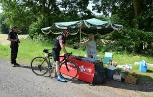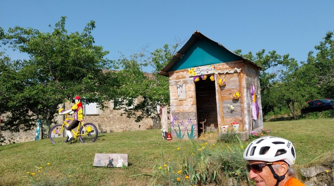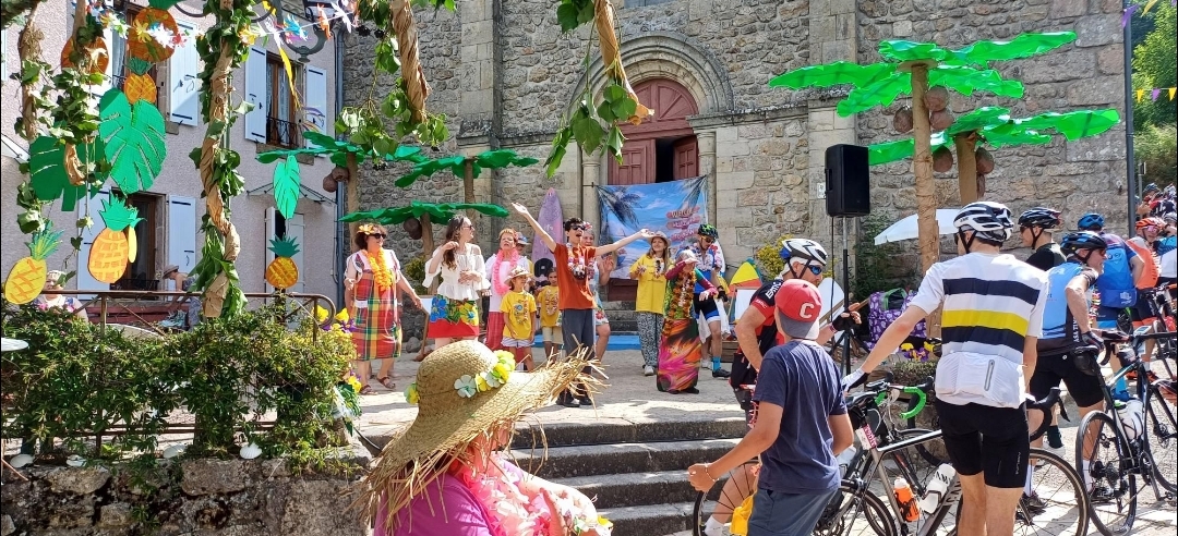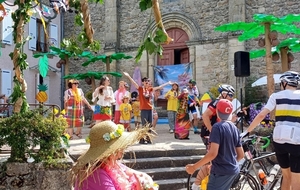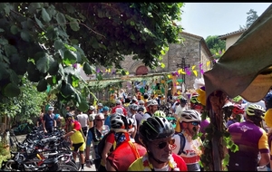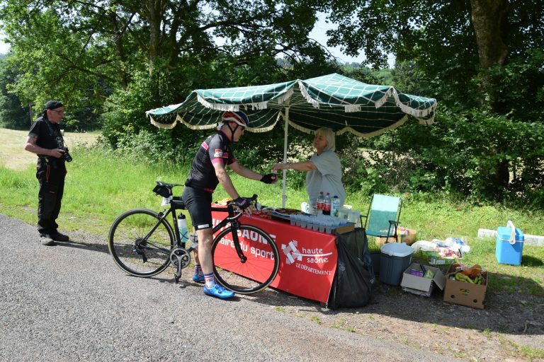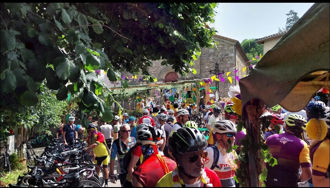 Parcours commun sur les 80 premiers km avec des ravitos dans tous les villages traversés. Impossible des tous les faire, quoique…. Les villageois ont comme d’habitude décoré leur beau village et les animations sont au RDV. Ambiance conviviale qui fait oublier le dénivelé déjà effectué. Les cols s’enchaînent naturellement, encore de nombreux cyclos nous accompagnent.