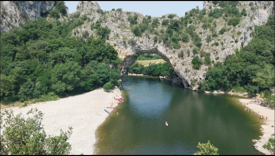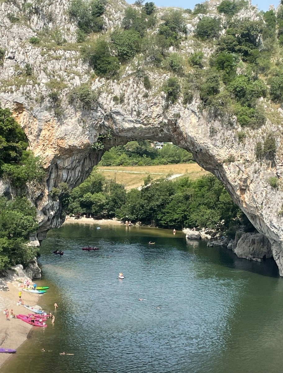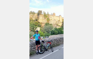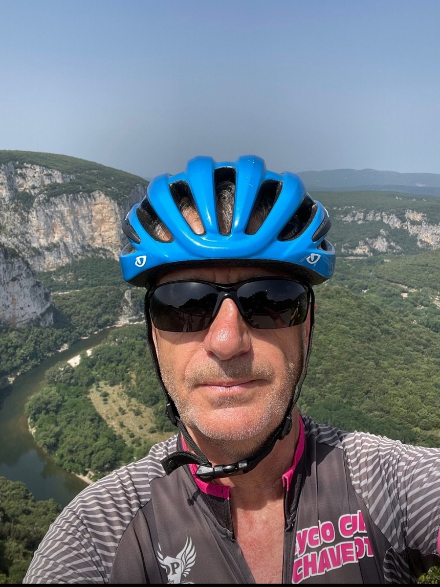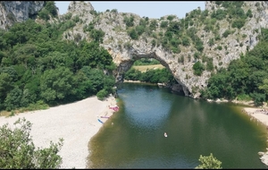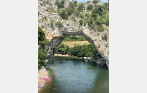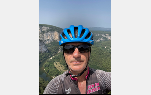 Après quelques km nous nous retrouvons plus isolés sur le parcours. Nous arrivons sur les gorges au niveau du belvédère du Serre de Tourre (magnifique vue) puis Pont d’Arc et enfin la photo incontournable à VALLON PONT D’ARC