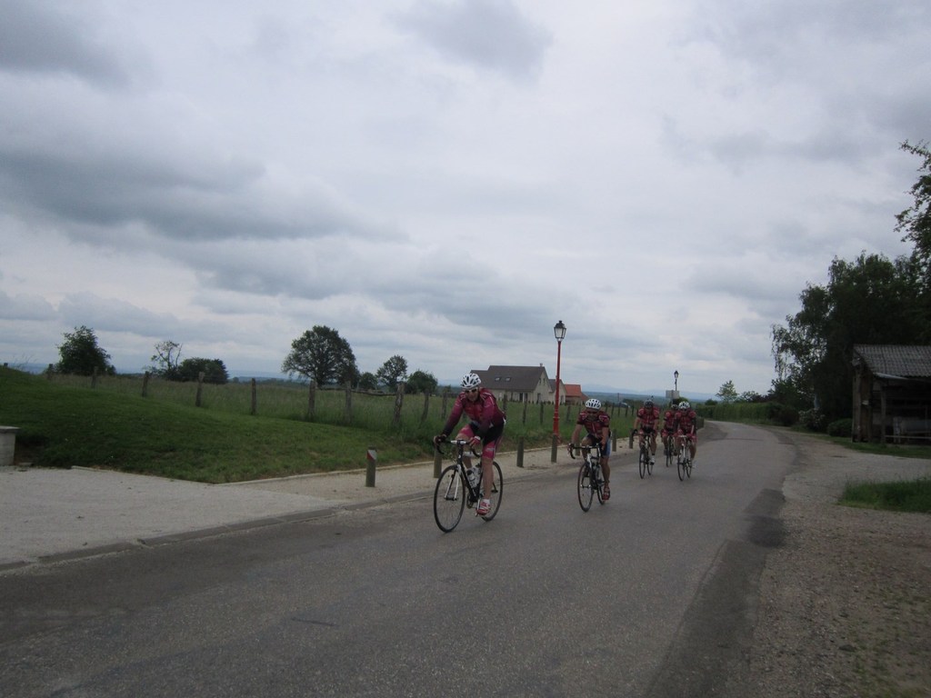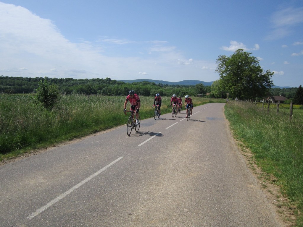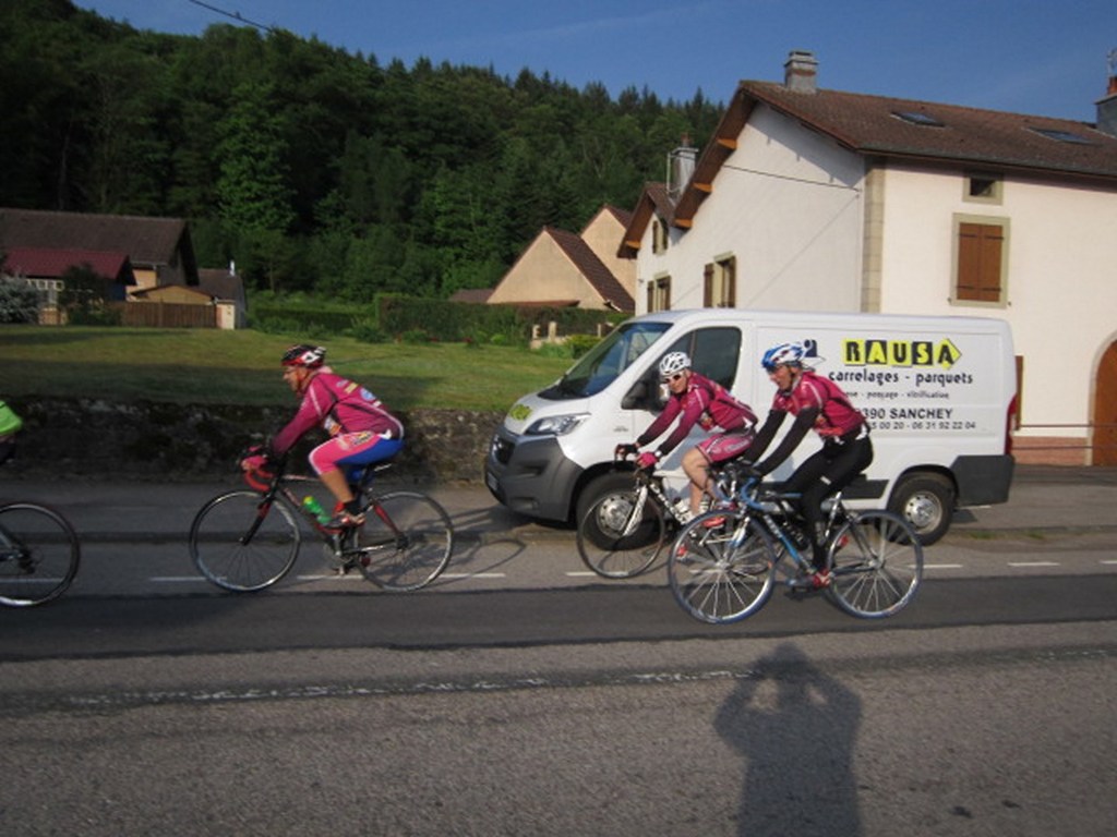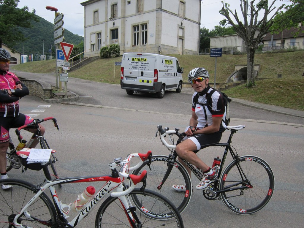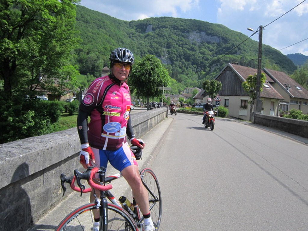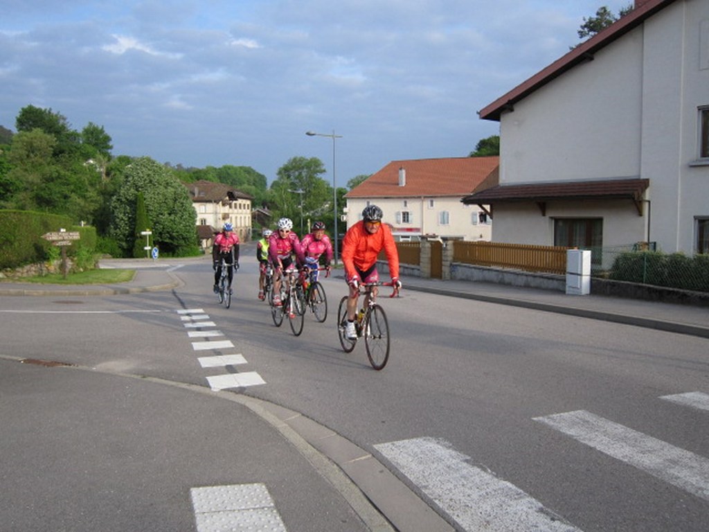 Départ à la fraîche, 7h15 le samedi 23 mai avec une température de 7°C...direction Ornans pour une première étape de 170 km et 1635 m de dénivelé en passant par le col du Mont de Fourche, Faucogney et la Mer. Ensuite Lure où un aimable boucher, cycliste averti, nous indique notre route. Nous prolongeons dans la plaine de la Haute Saône sur Villersexel, département du Doubs, Uzelle où nous faisons la pause méridienne. Un temps de récupération n'est pas pour nous déplaire, puis nous passons à Baume les Dames, et là changement de décor avec les contreforts du massif du Jura. Puis sur le plateau venté nous longeons le camp militaire