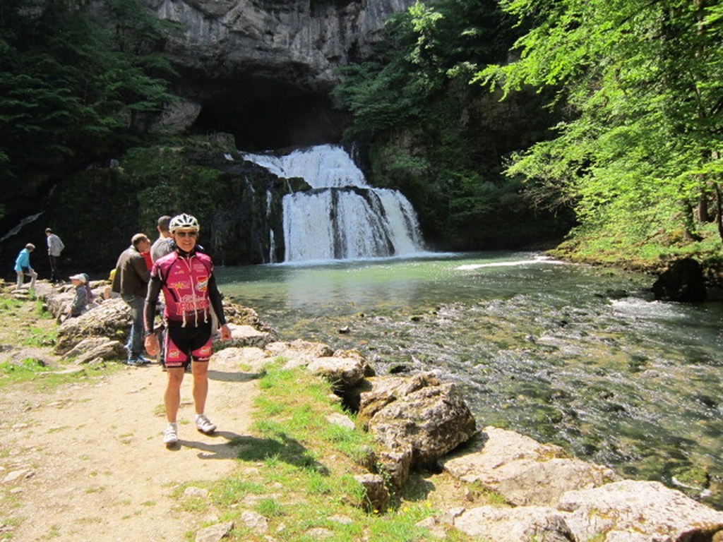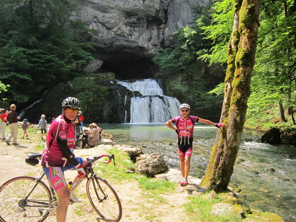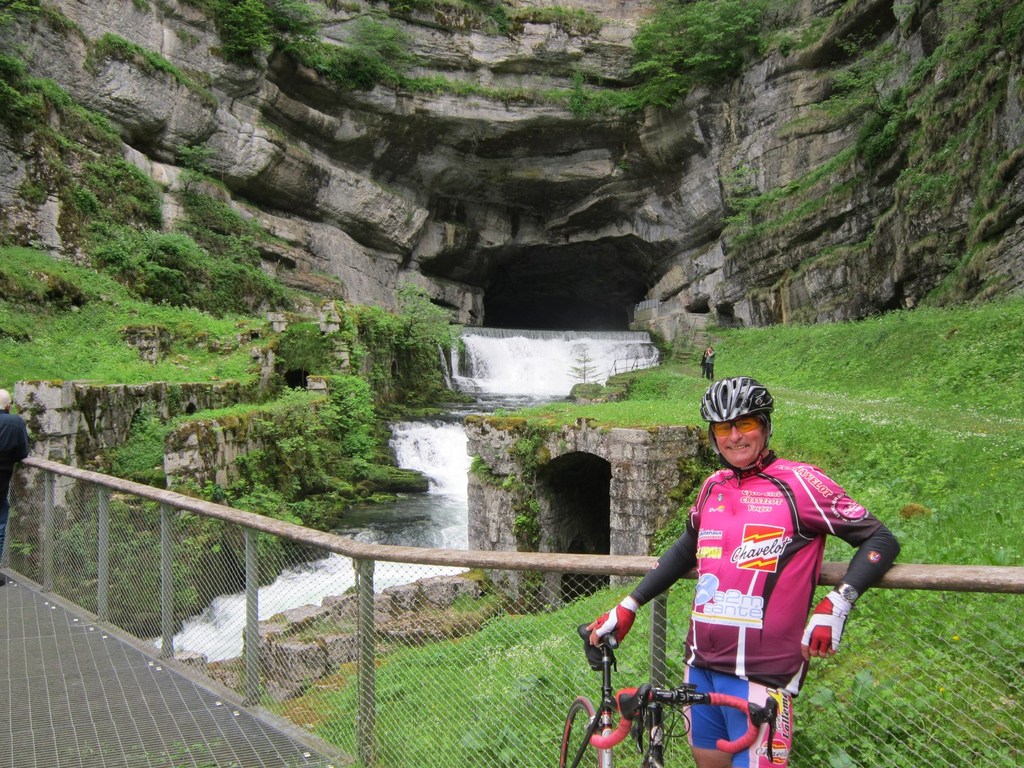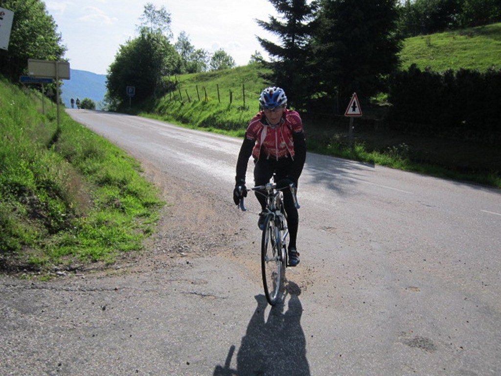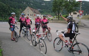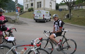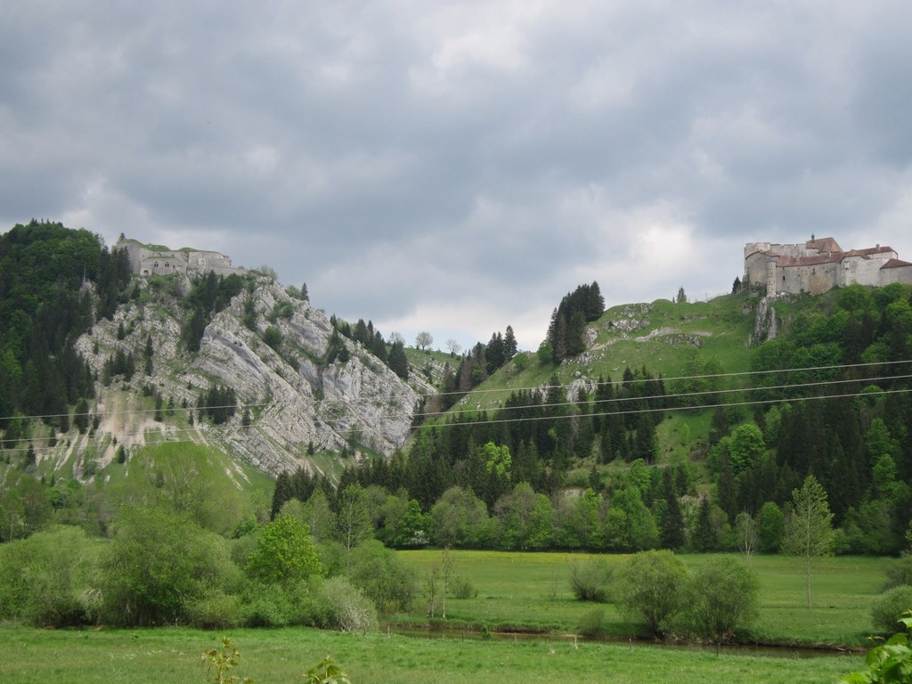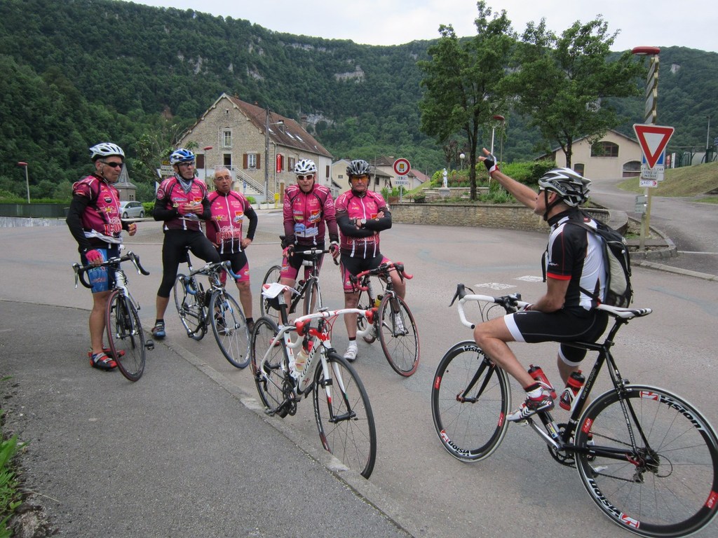 Départ à la fraîche, 7h15 le samedi 23 mai avec une température de 7°C...direction Ornans pour une première étape de 170 km et 1635 m de dénivelé en passant par le col du Mont de Fourche, Faucogney et la Mer. Ensuite Lure où un aimable boucher, cycliste averti, nous indique notre route. Nous prolongeons dans la plaine de la Haute Saône sur Villersexel, département du Doubs, Uzelle où nous faisons la pause méridienne. Un temps de récupération n'est pas pour nous déplaire, puis nous passons à Baume les Dames, et là changement de décor avec les contreforts du massif du Jura. Puis sur le plateau venté nous longeons le camp militaire