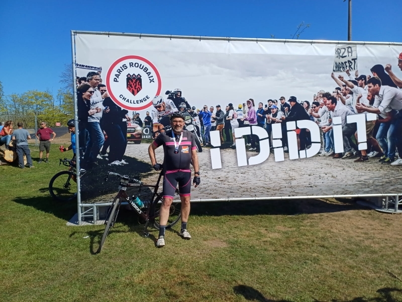 Et le lendemain, place à Bernard qui chevauche son vélo pour son traditionnel Paris-Roubaix, il en est rentré en bon état, un peu secoué (on le serait à moins), mais avec le sourire et l’espoir d’y retourner encore l’année prochaine !!!!
